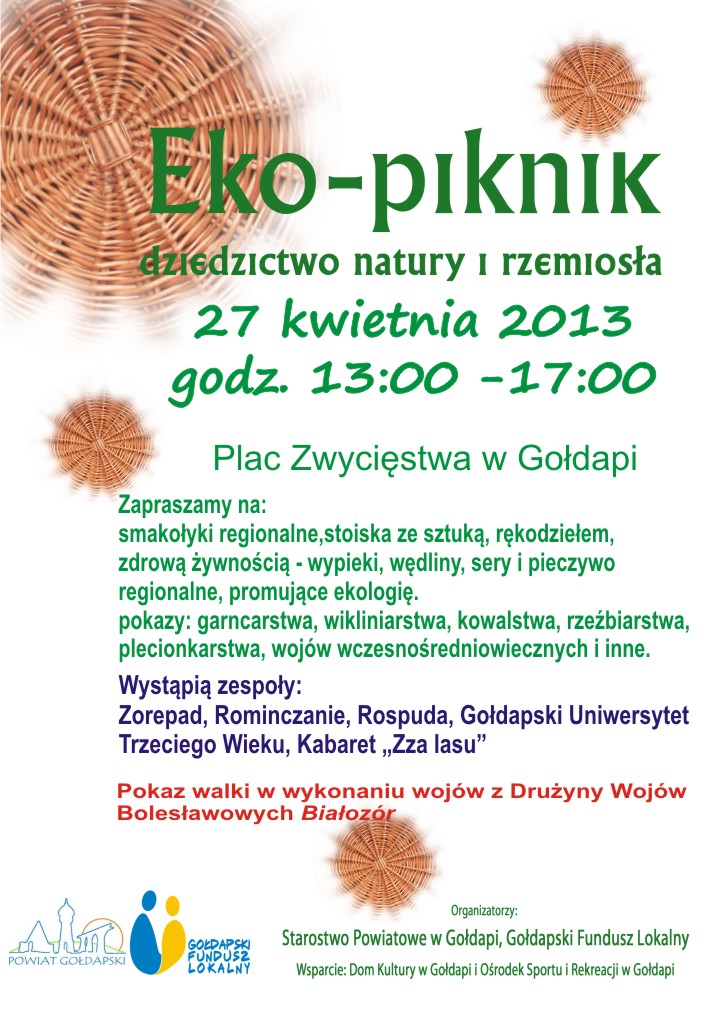 Z okazji Światowego dnia Ziemi w dniu 27 kwietnia 2013 r. na Placu Zwycięstwa w Parku Miejskim odbędzie się spotkanie „Eko-piknik – dziedzictwo natury i rzemiosła”. Wydarzenie organizuje Starostwo Powiatowe w Gołdapi i Gołdapski Fundusz Lokalny.