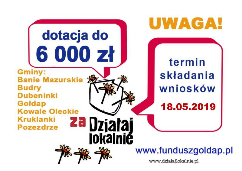• 26.04.2019 r., o godzinie 16.30 – spotkanie informacyjno-szkoleniowe w siedzibie Stowarzyszenia Gołdapski Fundusz Lokalny (ul. Wolności 11, 19-500 Gołdap)