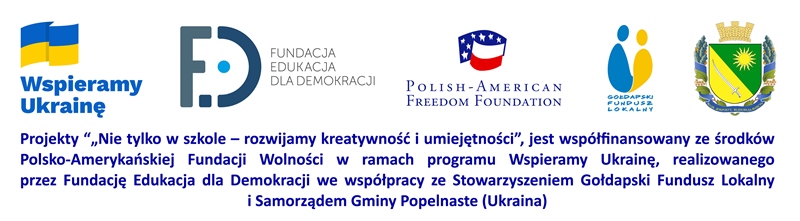 Z naszymi partnerami z gromady Popelnaste – Ukraina, realizujemy projekt Nie tylko w szkole – rozwijamy kreatywność i umiejętności, którego głównym celem jest wzmacnianie tożsamości i więzi społecznych pomiędzy mieszkańcami i uchodźcami wewnętrznymi, poprzez rozwój edukacji pozaszkolnej na terenie gromady.