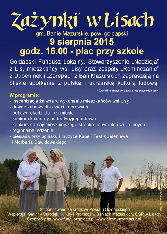 Lisy, Gmina Banie Mazurskie 9 sierpnia 2015 r., niedziela, godz. 16:00 – plac przy Szkole w Lisach Zażynki to rozpoczęcie żniw – wiązało się z tym wydarzeniem wiele tradycji, obyczajów, zabaw – wydarzenie „Zażynki w Lisach? przypomina jak nasi przodkowie rozpoczynali żniwa w Polsce i na Ukrainie.