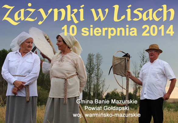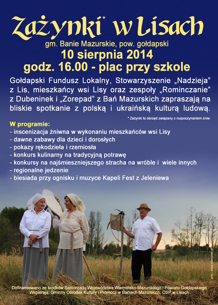 Lisy, Gmina Banie Mazurskie 10 sierpnia 2014 r., niedziela, godz. 16:00 – plac przy Szkole w Lisach Zażynki to rozpoczęcie żniw – wiązało się z tym wydarzeniem wiele tradycji, obyczajów, zabaw – wydarzenie „Zażynki w Lisach? przypomina jak nasi przodkowie rozpoczynali żniwa w Polsce i na Ukrainie.