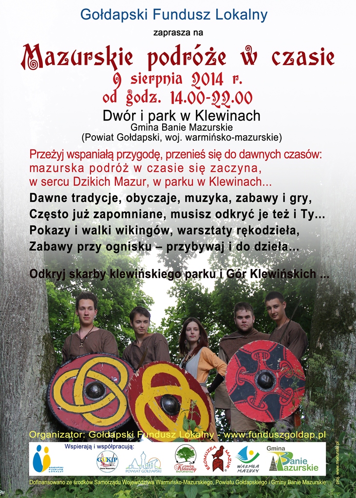 9 sierpnia 2014 r. „Mazurskie podróże w czasie? godz. 14.00 – Dwór i Park w Klewinach, Gmina Banie Mazurskie (Powiat Gołdapski, Woj. Warmińsko-Mazurskie). Przyjedź w mazurskie Góry Klewińskie i rozpocznij „podróż w czasie”.