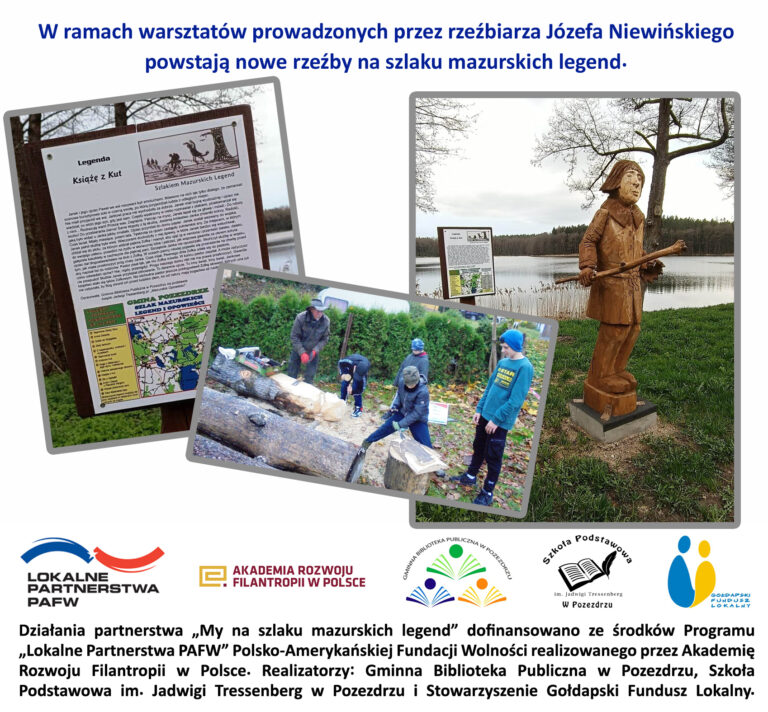 Nowe rzeźby na rowerowym szlaku mazurskich legend W ramach projektu „My na szlaku mazurskich legend” prowadzone są warsztaty rzeźbiarskie przez miejscowego rzeźbiarza i instruktora Józefa Niewińskiego. W warsztatach uczestniczy 8 osobowa grupa młodzieży i dorosłych. Pierwszy etap warsztatów został przeprowadzony jesienią 2022 roku, a kolejny zostanie zrealizowany wiosną 2023.